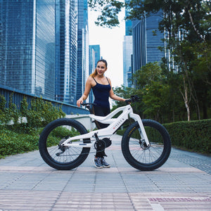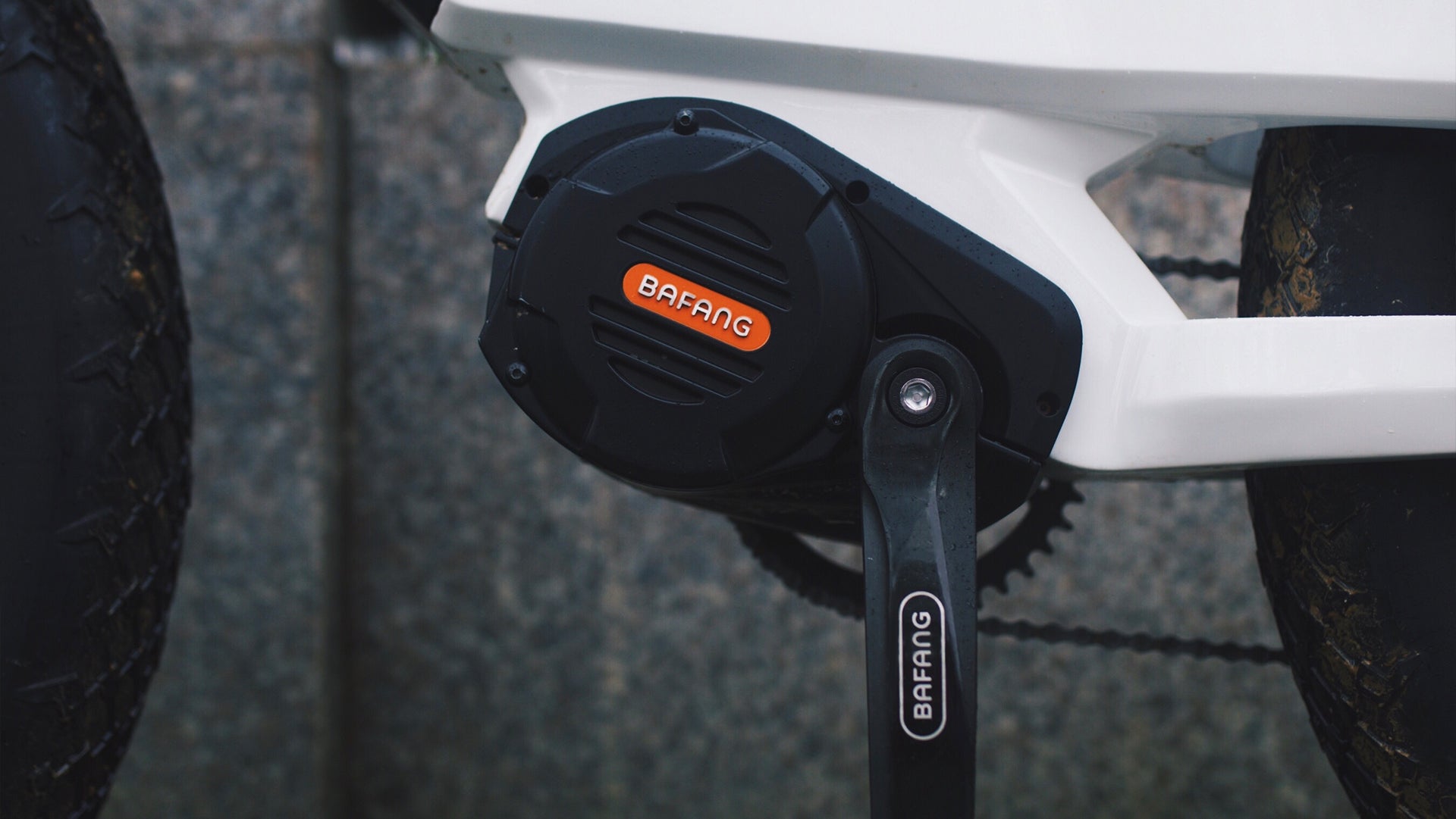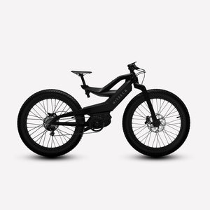 Lightweight carbon fiber frame, Mid-drive powertrain layout, Internal removable battery, 26"x4" fat tires front and rear, 160nm of torque
